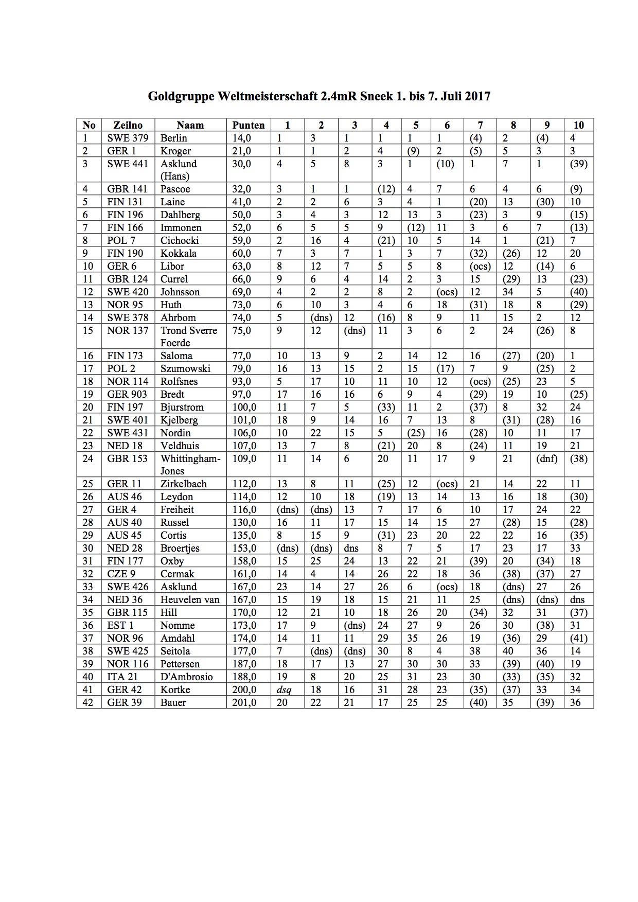 Der 4. Tag brachte noch einmal zwei Wettfahrten mit Winden bis 10 kn. Dann war Schluss; denn am 5. Tag wehte kein Wind mehr. Verdient mit gutem Abstand hat Stellan Berlin, bereits mehrfacher Weltmeister  aus Schweden, erneut gewonnen vor Heiko Kröger, der insbesondere am ersten Sturmtag groß auftrumpfte. Ulli Libor kam auf Platz 10 und Butze Bredt schob sich auf Platz 19. Das war ganz hervorragend, Männer.