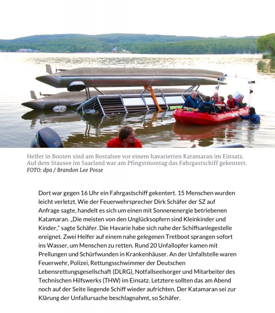 Zuerst mit dem Negativen vom Montag. Einige hatten es noch mitbekommen und fragten sich, was macht die Feuerwehr und der Hubschrauber am See. Das Solarschiff ist leider mit zu vielen Personen an Bord vor dem Center Park gekentert. Durch die schnelle Hilfe von Passanten, DLRG und Feuerwehr ist nicht viel passiert, es gab zum Glück nur leicht Verletzte.