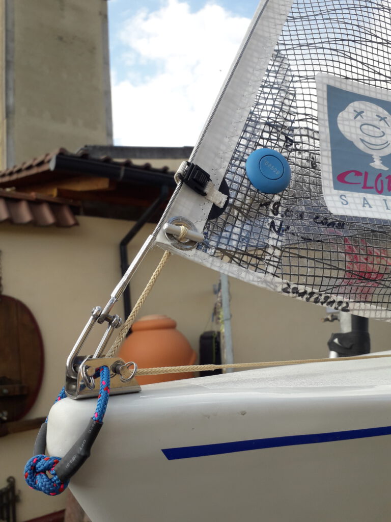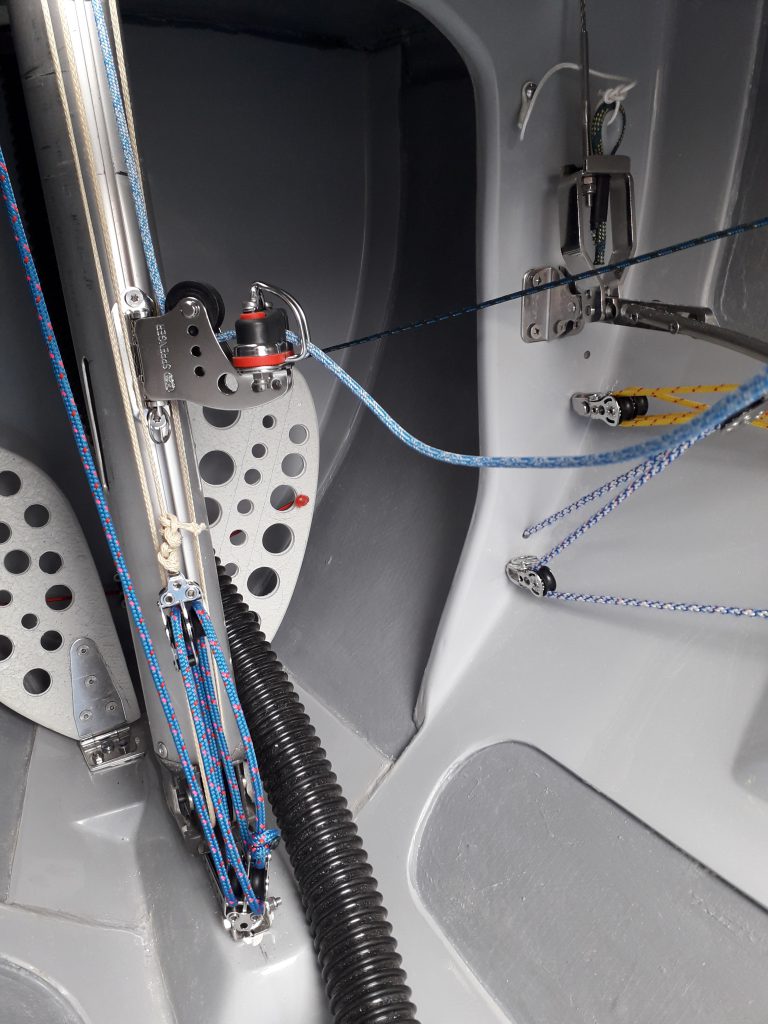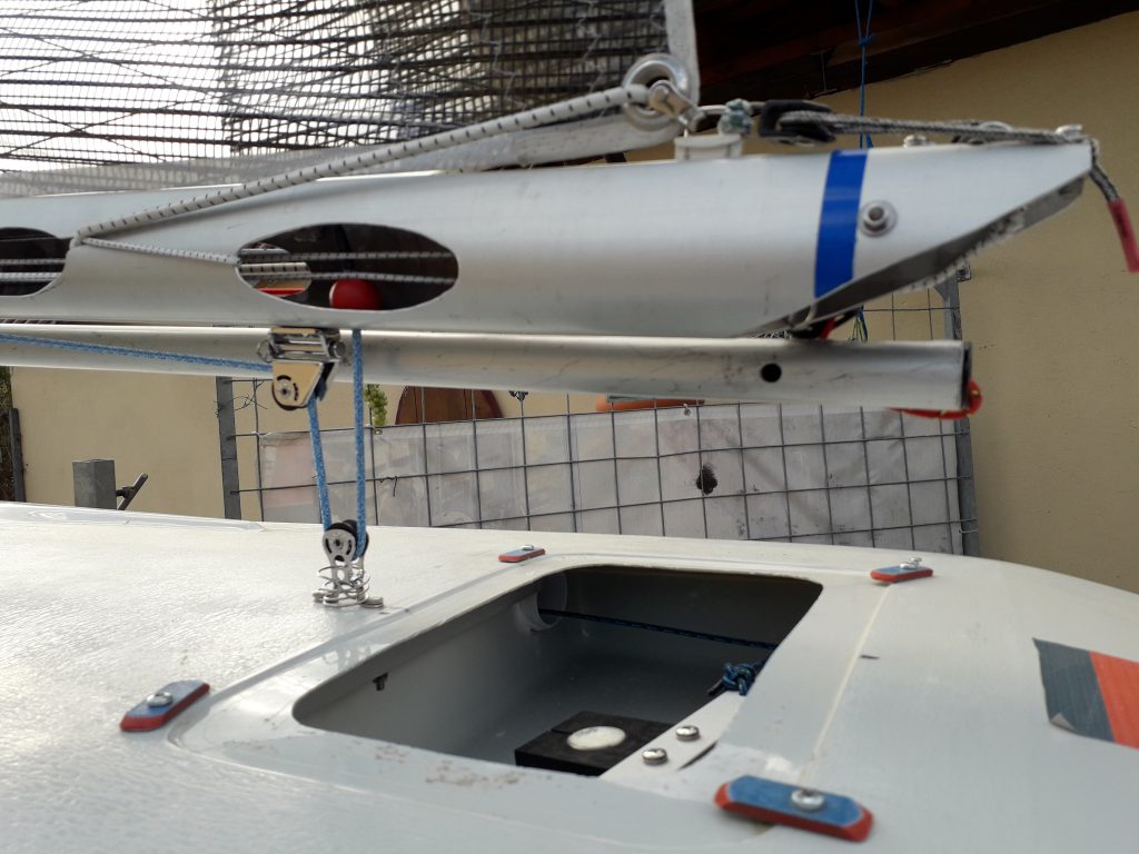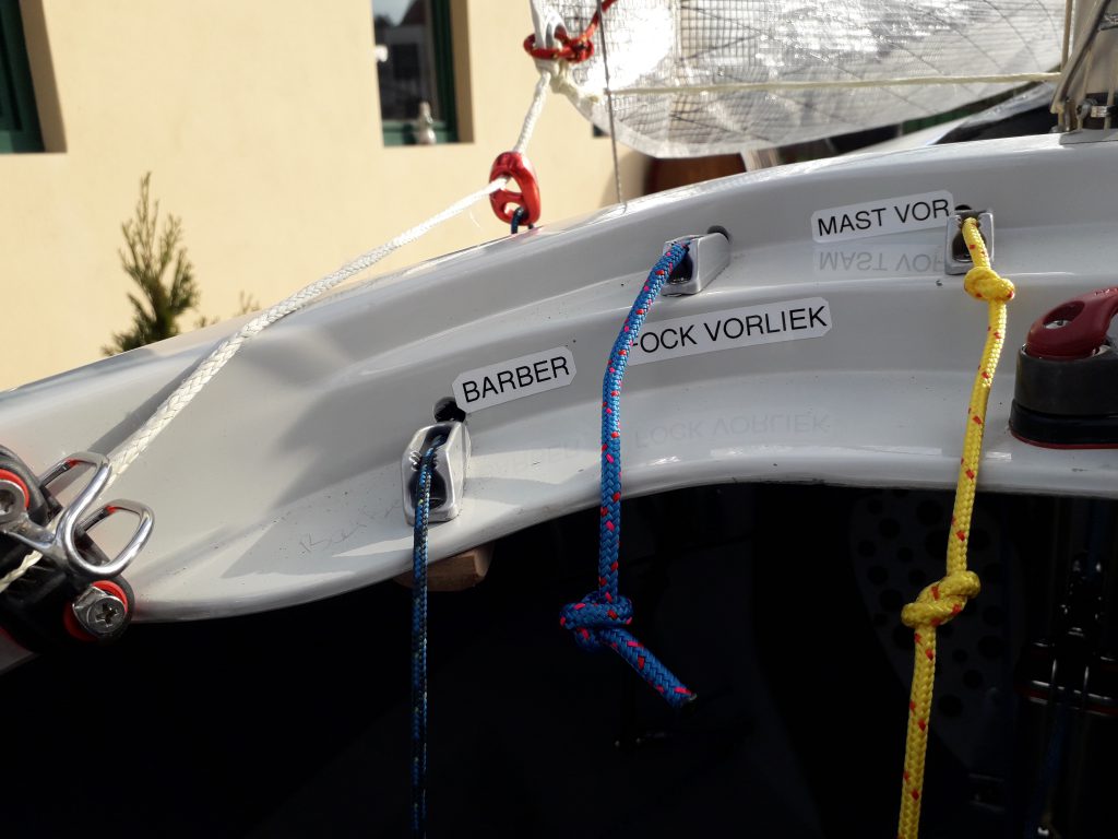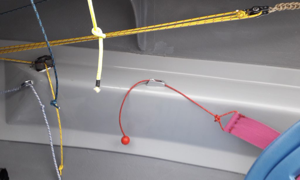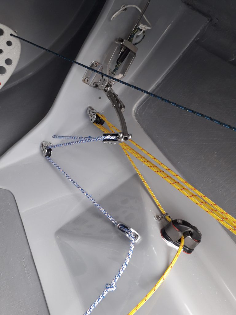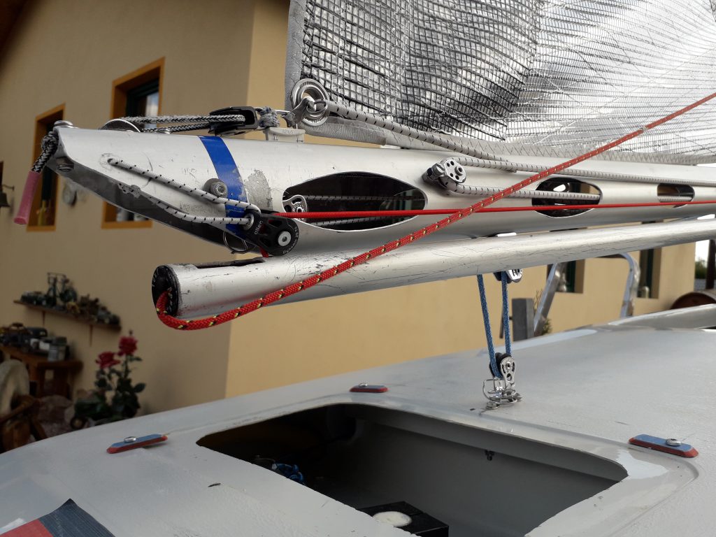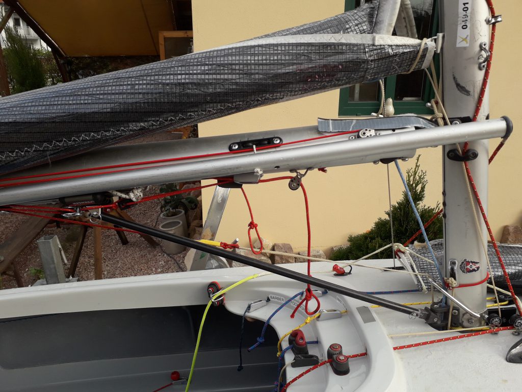 AbschleppöseBild 2: beschriftete Enden auf dem KlavierBild 3: einfache Großschotführung, Baumnock: dünnes Gummi für Spibaum Rückholer vornBild 4: dünnes Gummi, damit roter Spibaumvorholer abrutschen kann, dickes Gummi an der Umlenkrolle für Spibaumrückholer nach achternBild 5: schwarzer Kicker – bei Flaute wird Rutscher nach vorn gezogen und in Schlitzklemme neben Unterliekstrecker in der gewünschten Höhe arretiert, dadurch wird Achterliek entlastetBild 6: rot – Sitzverstellung, gelb – Achterstag, weiß-blau – WantenverstellungBild 7: gelb – Achterstag, weiß-blau – Wantenverstellung (Bb und Stb getrennt)Bild 8: blau-weiß – Großschot, blau-rot – Baumniederholer (führt zu Klemme auf Klavier Mitte, siehe Bild 5)